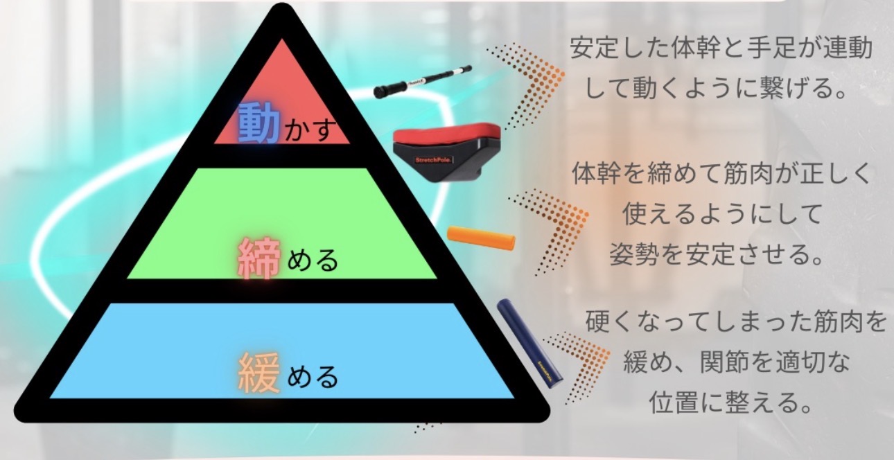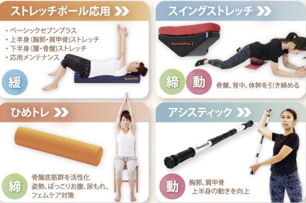 ストレッチポール、ひめトレ、スイングストレッチ、アシスティックを活用し、