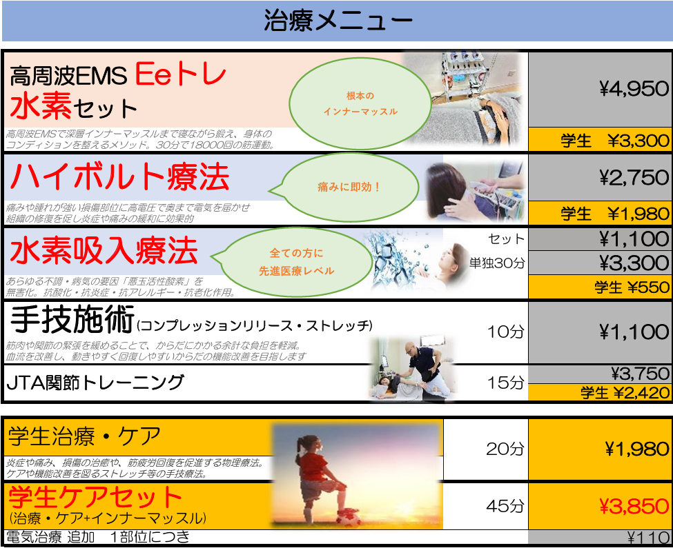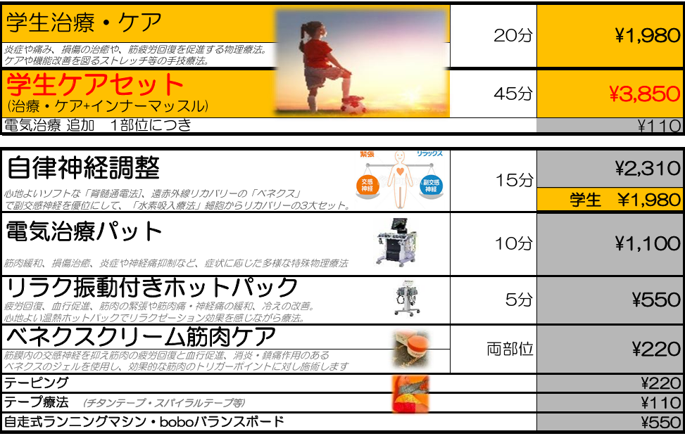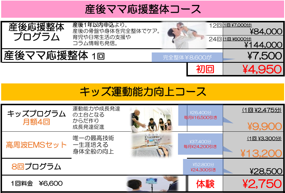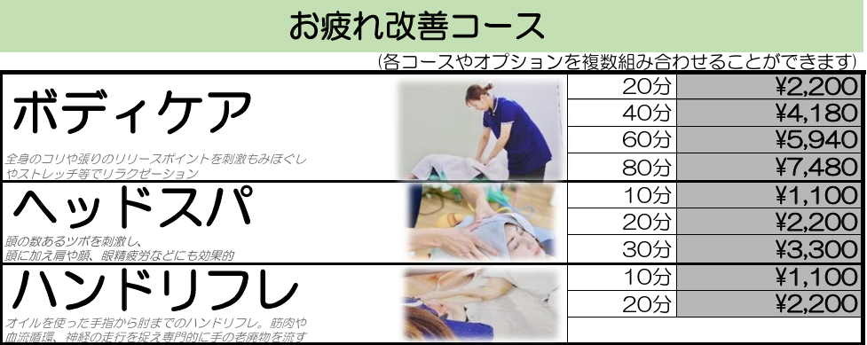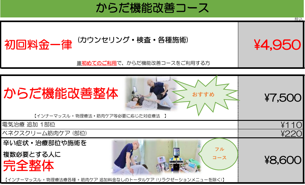 料金表 あなたのニーズに応じた 幅広いメニュー・コースをご用意しています からだ機能改善コース(治療・整体メニュー) からだの痛み・症状、姿勢改善やリハビリ、産後ママ応援整体等の整体コースをご希望の方 初めてのご利用:一律4,950円 今すぐネットから予約 お疲れ改善コース(リラクゼーションメニュー)